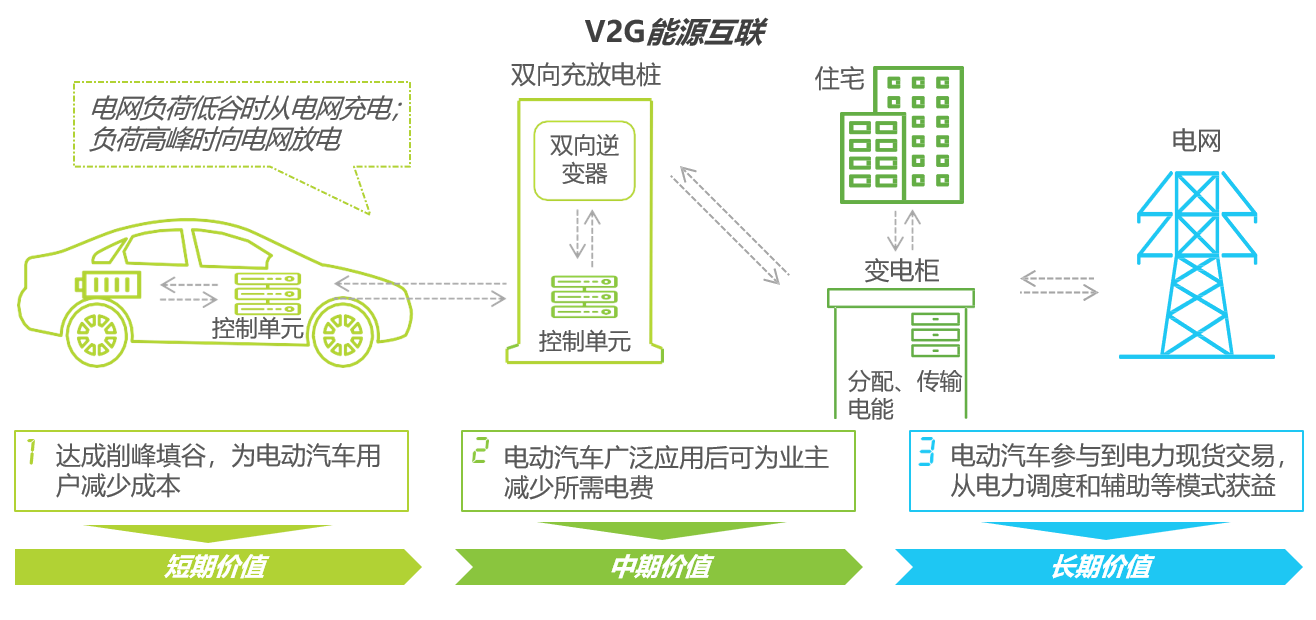 V2G模式試點(diǎn)正在進(jìn)行:V2G可達(dá)成車輛與電網(wǎng)之間的能源互聯(lián),實(shí)現(xiàn)儲(chǔ)能調(diào)峰、改善電能質(zhì)量、調(diào)整用電負(fù)荷等服務(wù),將成為未來的長期發(fā)展方向。