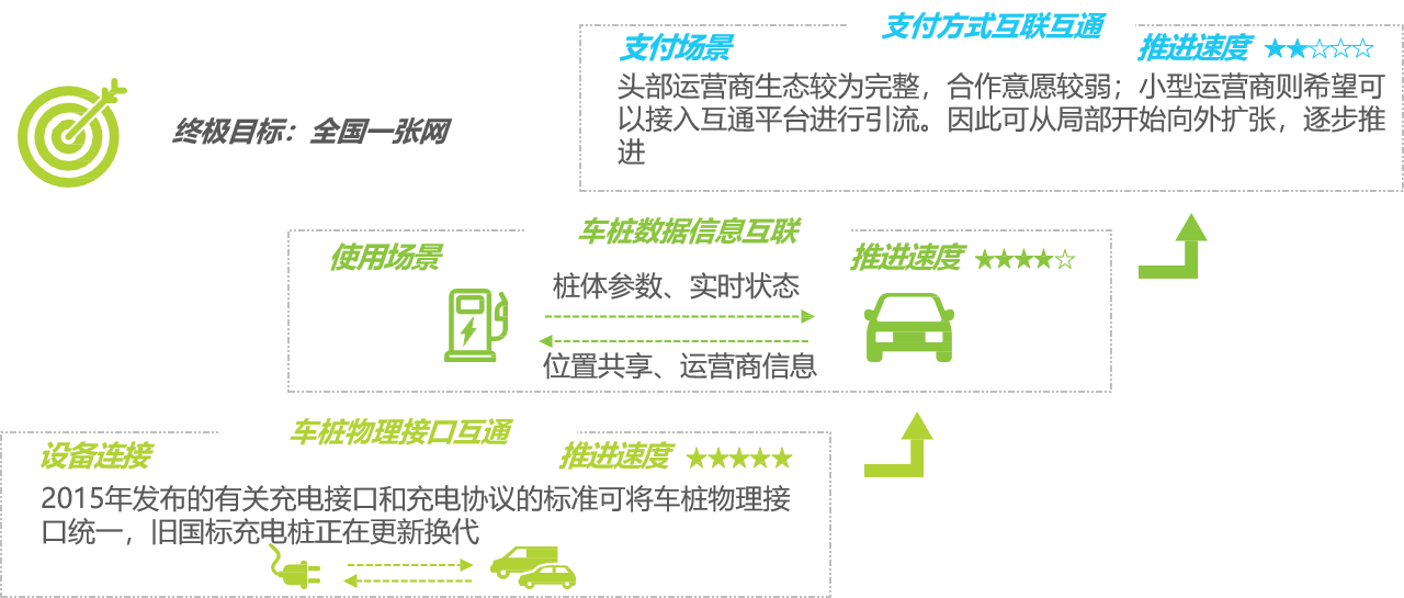 互聯(lián)互通成為行業(yè)共識(shí):由于利益分配問題支付互通短期內(nèi)阻礙較大,行業(yè)實(shí)現(xiàn)電動(dòng)汽車、充電樁、運(yùn)營商三方之間的互聯(lián)互通,可有效解決這一難題,通過信息數(shù)據(jù)的分析充分提高單樁充電設(shè)施的利用效率。