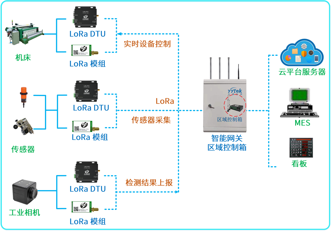 在工廠內的各個終端節點(傳感器、工業設備、工業相機)使用LORA DTU和LORA模組升級設備和傳感器,使設備具備無線傳輸能力,實現對生產數據的實時上報和操作指令接收。通過云涌智能無線網關對著這些終端節點進行數據的采集和接收,再由網關進行數據分析和協議轉換,與上層的不同業務系統進行數據的交互。