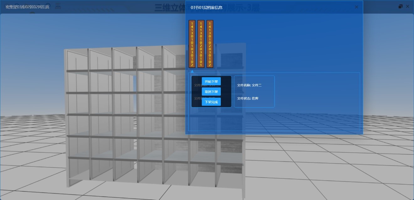 本系統結合用戶的深度業務邏輯,通過Three.Js三維可視化技術搭建數字孿生模型,使用IOT技術、運行歷史數據,多尺度、多概率的仿真過程,在虛擬空間中完成映射,將真實設備與數字模型進行耦合交互,實現設備實時運行狀態與數字孿生對象動作對應(支持密集架開啟、關閉、查詢文件等)。